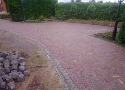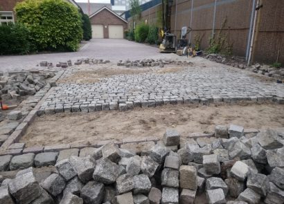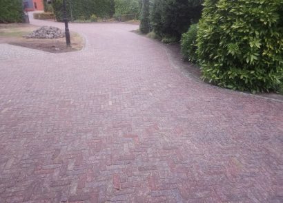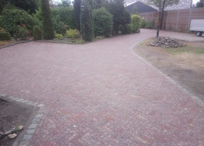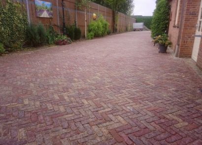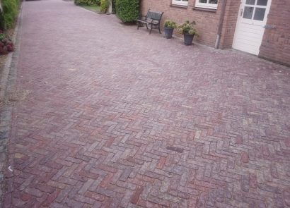 Onderstaande oprit is uitgevoerd in oude gebakken dikformaten. Het mooie aan deze partij dikformaten is dat er veel verschillende kleuren inzitten. Als legverband is er voor een keperverband gekozen met een omlijsting van kinderkoppen om helemaal die authentieke uitstraling te krijgen.