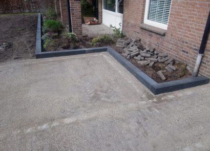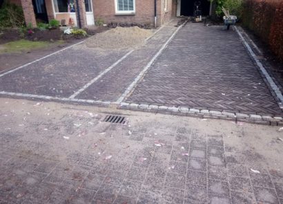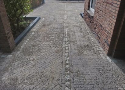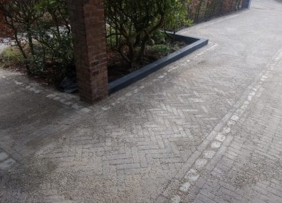 Een dubbele oprit van lingeformaat-klinkers uitgevoerd in een vissegraatverband . Het looppad naar de voordeur is uitgevoerd in een halfsteensverband en valt extra op door de omlijsting met porfier kasseien. De gemetselde stapelblokken zorgen voor een mooie afscheiding met de tuin.