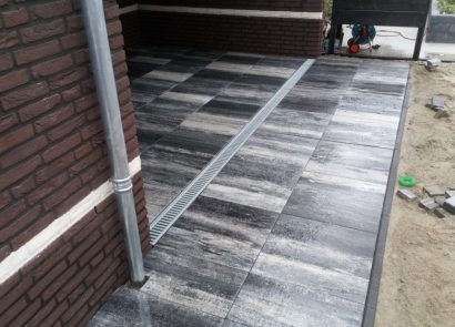 Onderstaand terras uitgevoerd in gevlamde 60×60 betontegels geeft een moderne uitstraling. Een goede afwatering wordt verzorgd door het plaatsen van een bijpassende draingoot.